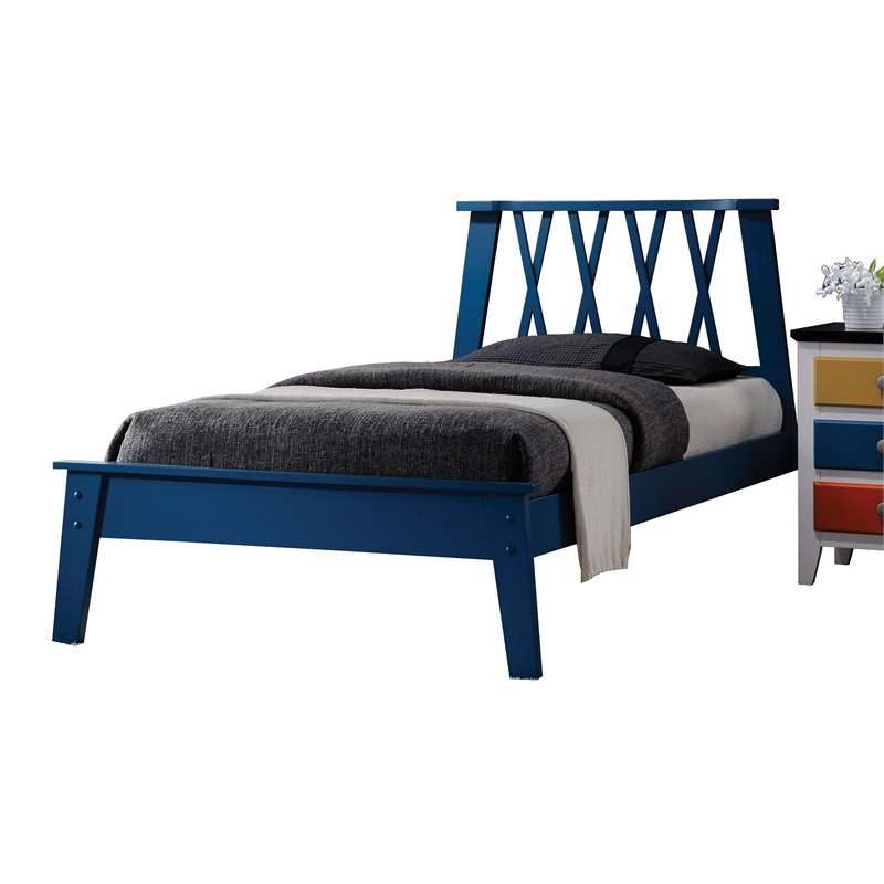 | ACME Furniture - Beds - 25380Q - The Moffett Collection Bed features expert construction of solid woods and veneers. High Panel Headboard with X pattern design and low profile footboard are complemented with a slat system foundation that allows it to be used with or without box spring. Finish: Dark BlueMaterial: Poplar WoodX Style Headboard13 SlatsLow Profile FootboardAvailable in 2 ColorsSpecifications:Overall Product Dimensions: 40H x 86W x 66DProduct Weight: 63 lbs