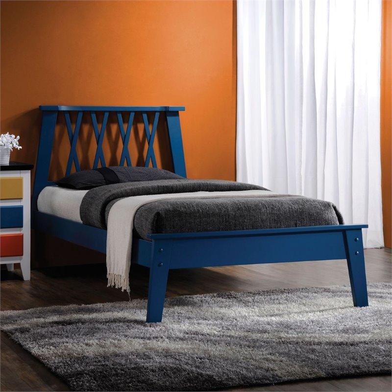 | ACME Furniture - Beds - 25385T - The Moffett Collection Bed features expert construction of solid woods and veneers. High Panel Headboard with X pattern design and low profile footboard are complemented with a slat system foundation that allows it to be used with or without box spring. Finish: Dark BlueMaterial: Poplar WoodX Style Headboard13 SlatsLow Profile FootboardAvailable in 2 ColorsSpecifications:Overall Product Dimensions: 40H x 80W x 44DProduct Weight: 47 lbs