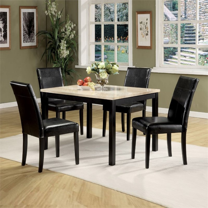 | ACME Furniture - Dining Sets - 06776 - This 5 PC Portland Brown Dining Set is a sleek addition to any eating area in your home. Featuring a warm finish, straight tapered legs, and a white faux marble table top, the table is a functional and smart furniture choice for your home. The four coordinating included brown side chairs feature leather-like vinyl upholstery with a stitched designed back. Finish: White Faux Marble & BlackMaterial: Faux Marble, PU5Pc Pack Dining SetFaux MarbleTable: Wooden Square Straight LegPadded Seat & Back: Faux Leather CushionSpecifications:Overall Product Dimensions: 30H x 47W x 36DProduct Weight: 99 lbsseat height:18