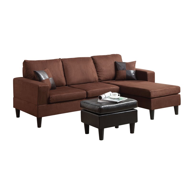 | ACME Furniture - Sectionals - 15900 - The Robyn Reversible Sectional Collection features a Modern-Contemporary look, ideal for those wanting a cozy but sleek furniture piece to add to their living room; while maximizing the small spaces and maintaining style. The Reversible Sectional comes in a Chocolate Microfiber Finish, reflecting a clean-lined seat and back cushions, loose seats cushions, track arms and tapered plastic legs complete the contemporary look. The Robyn Sectional includes a reversible ottoman, which allows to custom create your choice of sectional by simply placing the ottoman at either end of the sofa; choose from center, right-arm or left-arm chaise. An additional ottoman comes in Espresso PU and complemented with 2 accent pillows. You will not find a better set that fits both style and comfort for the price. Finish: Chocolate & Espresso; Material: Microfiber, PU; Reversible Chaise; Ottoman Included; Pillows Included; Loose Back & Seat Cusion; Wood Like Legs . Specifications: Overall Product Dimensions: 35H x 80W x 53D; Ottoman Dimensions: 17 H x 22 W x 16 D; Product Weight: 102 lbs; Seat Height:22 .