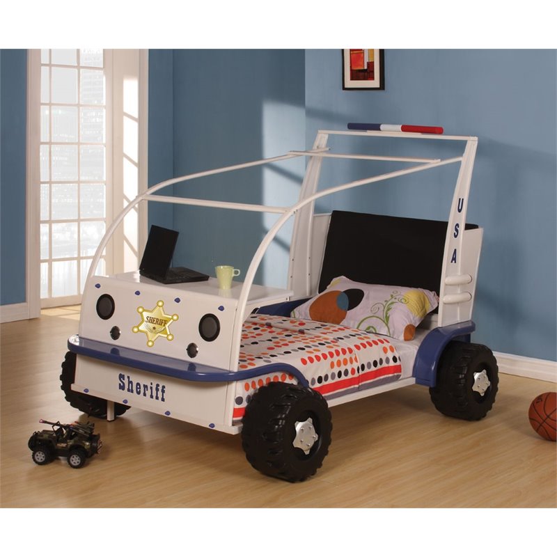 | ACME Furniture - Kids Beds - 37290T - Encourage imagination and a taste for adventure with this bold and fabulous four-wheeler-inspired bed!. The gun metal finish accentuates the metal construction and displays the added dual-use front hood table and padded leatherette headboard beautifully. Finish: White & Blue SheriffMaterial: Metal, MDF, PU, FP FoamBox Spring NOT RequiredSlat System IncludedSpecifications:Overall Product Dimensions: 61H x 87W x 58DProduct Weight: 162 lbsweight capacity: 200Lbs