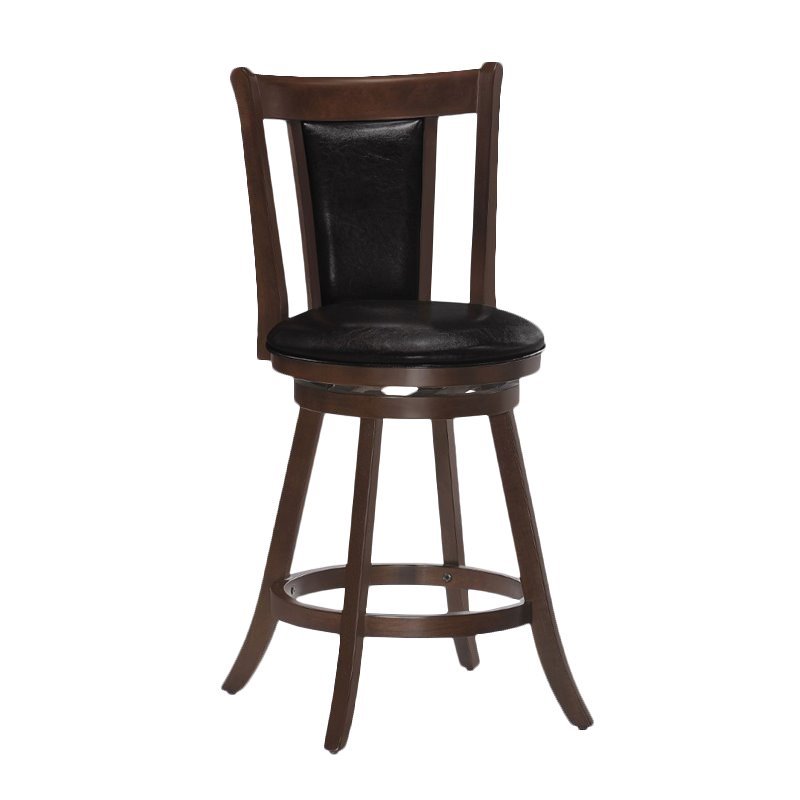 | ACME Furniture - Bar Stools - 96081 - This Tabib swivel counter stool is the perfect option for furnishing your contemporary and casual bar or kitchen. The tight seat cushion upholstered in black faux leather is easy to clean and provides a comfy place to relax while hanging with friends. This chair also features a padded back with decoratively pierced sides. Back and splayed legs are finished in Cappuccino finish. Finish: CappuccinoMaterial: PU (5%), CAFR Foam (5%), Rubber Wood (50%), Veneer (25%), MDF (5%), Hardware (2%), Packing (8%)Swivel Mechanism IncludedWooden BackrestPadded Seat & Back Cushion: PUSpecifications:Overall Product Dimensions: 38H x 24W x 19DProduct Weight: 20 lbsweight capacity: 250Lbsseat height:24