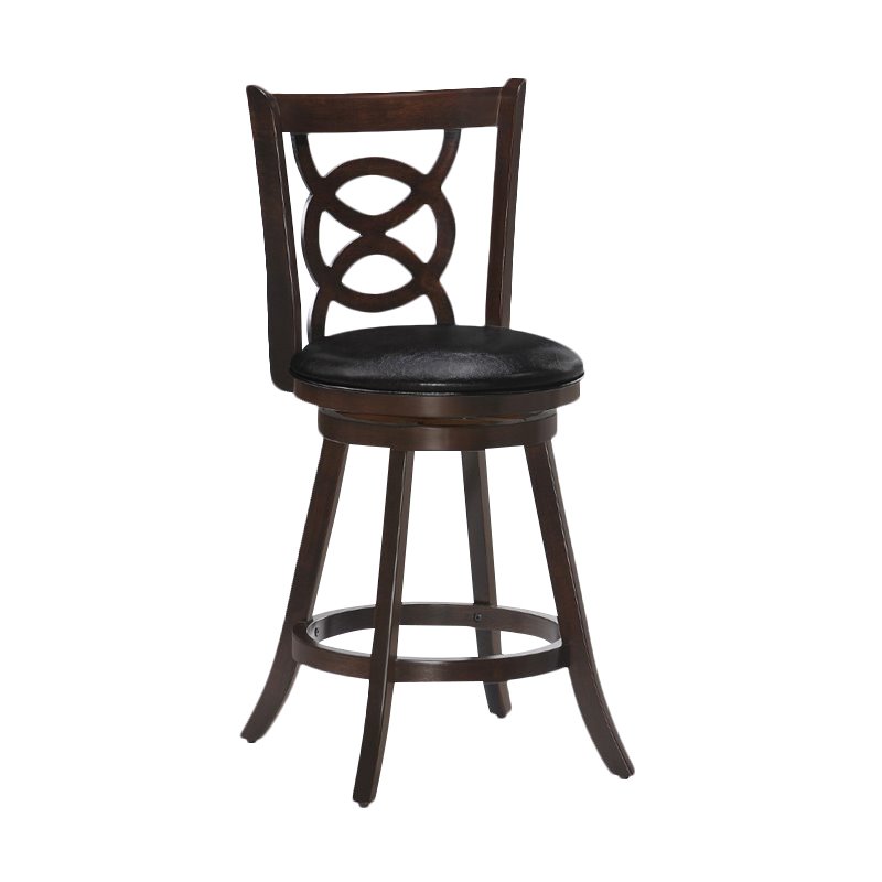 | ACME Furniture - Bar Stools - 96084 - This Tabib swivel counter stool is the perfect option for furnishing your contemporary and casual bar or kitchen. The tight seat cushion upholstered in black faux leather is easy to clean and provides a comfy place to relax while hanging with friends. This chair also features a overlapped circles. Back and splayed legs are finished in cherry finish. Finish: CappuccinoMaterial: PU (5%), CAFR Foam (5%), Rubber Wood (50%), Veneer (25%), MDF (5%), Hardware (2%), Packing (8%)Swivel Mechanism IncludedWooden Overlapped Circles BackrestPadded Seat & Back Cushion: PUSpecifications:Overall Product Dimensions: 38H x 24W x 19DProduct Weight: 20 lbsweight capacity: 250Lbsseat height:24