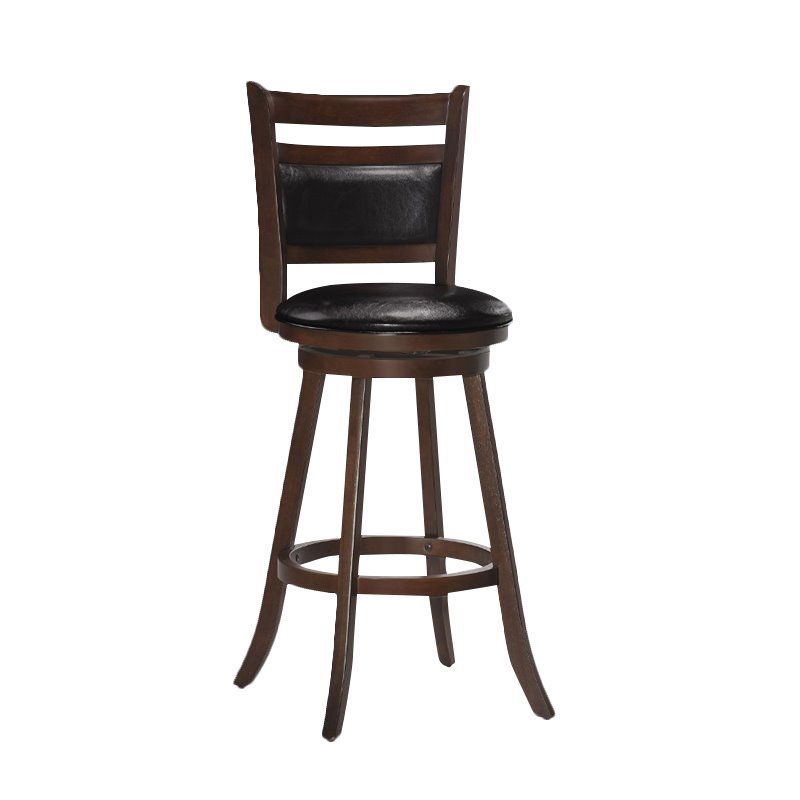 | ACME Furniture - Bar Stools - 96086 - This Tabib swivel bar chair is the perfect option for furnishing your contemporary and casual bar or kitchen. The tight seat cushion upholstered in black faux leather is easy to clean and provides a comfy place to relax while hanging with friends. This chair also features a padded back with decoratively pierced sides. Back and splayed legs are finished in Cappuccino finish. Finish: CappuccinoMaterial: PU (5%), CAFR Foam (5%), Rubber Wood (50%), Veneer (25%), MDF (5%), Hardware (2%), Packing (8%)Swivel Mechanism IncludedWooden Back TrimPadded Seat & Back Cushion: PUSpecifications:Overall Product Dimensions: 43H x 24W x 20DProduct Weight: 22 lbsweight capacity: 250Lbsseat height:29