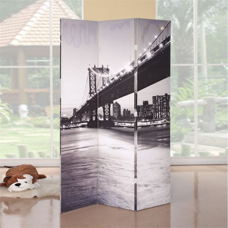 | ACME Furniture - Room Dividers - 98017 - The Trudy Screen will transport yourself to a charming, quaint view by adding this whimsical floor screen to your home. Three wood panels are covered in canvas illustrating a calming scene from a quiet town. Perfect for dividing up a room or just adding a fun element to your kitchen or living space. Assembled Finish: Bridge SceneryMaterial: Pine & CanvasTwo Sided SceneryFull AssembledBridge Scenery3-PanelSpecifications:Overall Product Dimensions: 71H x 16W x 1DProduct Weight: 19 lbs