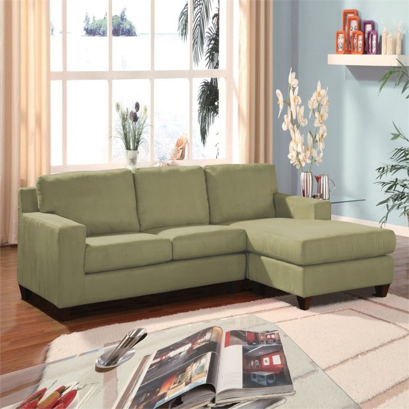 | ACME Furniture - Sectionals - 05915 - The Vogue Reversible Sectional Collection features a Modern-Contemporary look, ideal for those wanting a cozy but sleek furniture piece to add to their living room; while maximizing the small spaces and maintaining style. The Reversible Sectional comes in a Microfiber Upholstery, reflecting a clean-lined seat and back cushions, loose cushions, track arms and tapered plastic legs complete the contemporary look. The Vogue Sectional includes a reversible ottoman, which allows to custom create your choice of sectional by simply placing the ottoman at either end of the sofa; choose from center, right-arm or left-arm chaise. You will not find a better set that fits both style and comfort for the price. Finish: SageMaterial: Microfiber, Frame: Hardwood w/Polywood, Foam, Plastic LegReversible ChaisePillows Not IncludedLoose Back & Seat CusionWood Like LegsSpecifications:Overall Product Dimensions: 38H x 88W x 33DProduct Weight: 100 lbsweight capacity: 300Lbsseat height:19