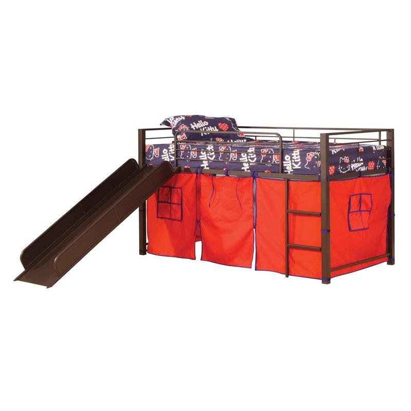 | ACME Furniture - Bunk Beds - 37270 - This fun loft bed will be a welcome addition to your child’s bedroom. Create a cool fort for our little one with this loft twin size bed. An attached ladder makes it easy to climb to the top while a slide offers a great way to get back down! A tent covers the opening below the bed, for a fun spot to play with toys, read a book, or play hide and seek. Finish: Brown CoffeeMaterial: Metal Tube, Fabric TentMetal TubeRed and Blue Tent RemovableSpecifications:Overall Product Dimensions: 45H x 79W x 42DProduct Weight: 102 lbs