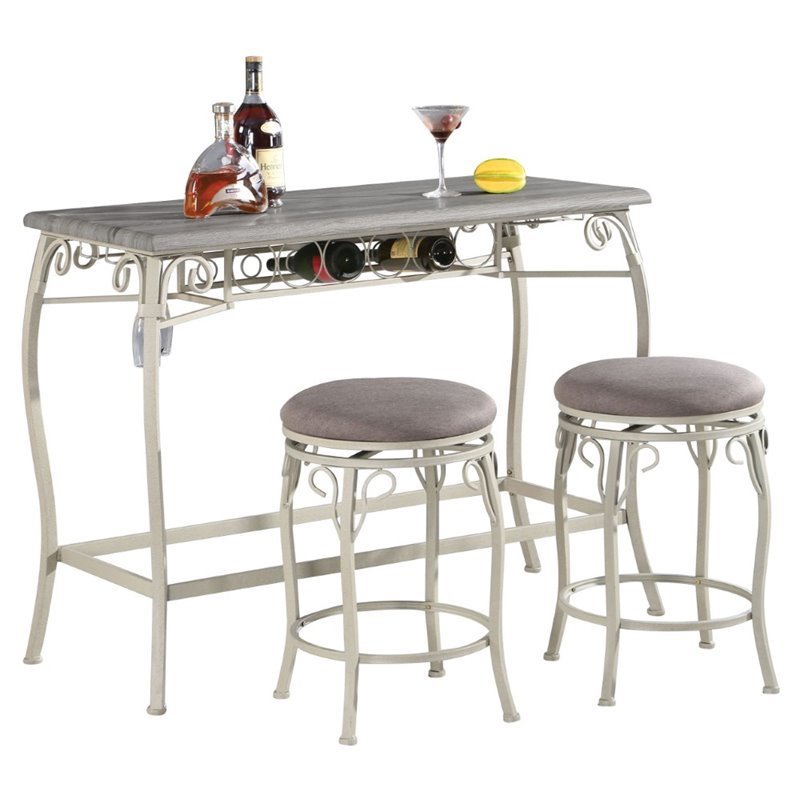 | ACME Furniture - Pub Sets - 72520 - The Irmeda 3pc pack counter height dining set carries in oak gray finish. The table with wine bottle and wine glass rack and the chair with padded gray fabric seat cushion. With a blend of comfort and style, this dining set will make your dining area full with style that you can’t miss! Finish: Oak GrayMaterials: MDF, Wood Veneer, Metal, Fabric, FoamContemporarySpecifications:Dining Table Dimensions: 36 H x 48 W x 21 DChair Dimensions: 24 H x 17 W x 17 DProduct Weight: 26 lbsSeat Height: 24
