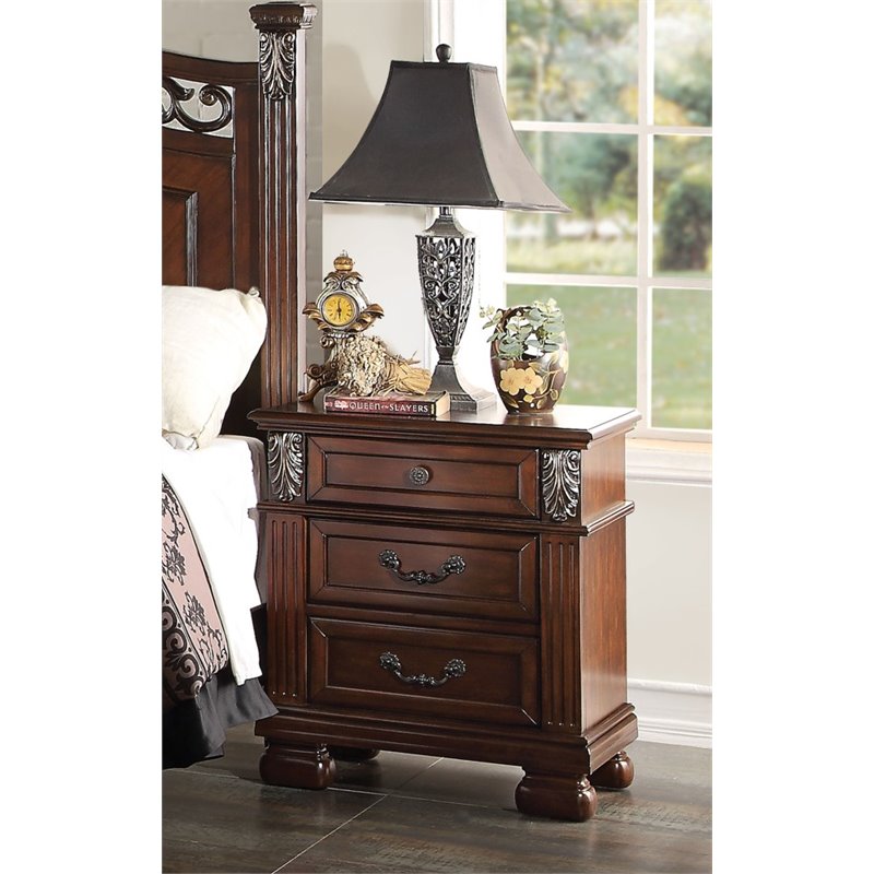 | ACME Furniture - Nightstands - 22773 - This collection features panel headboard with cursive carving details and pieces with traditional bun feet, all in dark walnut finish. The matching chest, nightstand, and dresser offer plenty of storage spaces. The pieces in this collection are finished with a dark walnut and burnished silver drawer pulls. Finish: Dark WalnutMaterial: Pine Wood3 drawers, KD LegSide Metal Glide (3 Ball Bearing)Dovetail: English Front & BackFelt Lined Top DrawerSpecifications:Overall Product Dimensions: 28.03 H x 25 W x 15.94 DProduct Weight: 53 lbs