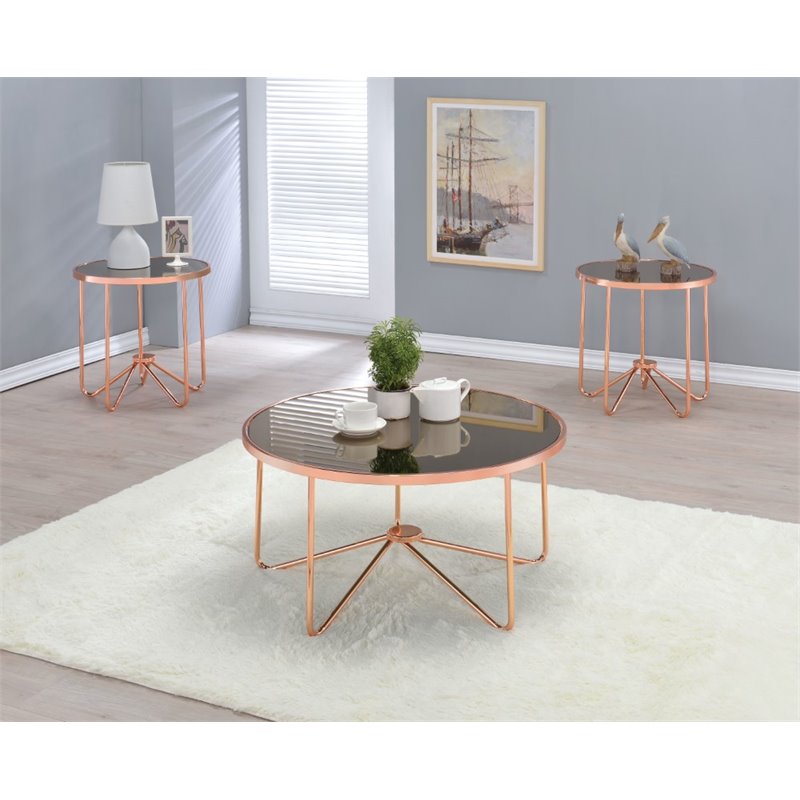 | ACME Furniture - Coffee Table Sets - 81595 - This Myron modern occasional table set brings a unique yet classy look to your living room. With effortless infusion of smoky glass and unique retro inspired rose gold metal base, this piece will naturally blend in your living room, making it a statement of any room decor. Finish: Rose Copper, SmokyMaterials: Mirror, Metal TubeContemporarySpecifications:Coffee Table Dimensions: 18 H x 34 W x 34 DEnd Table Dimensions: 22 H x 22 W x 22 DProduct Weight: 45 lbs