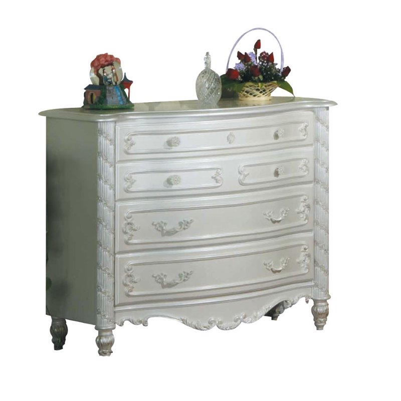 | ACME Furniture - Bachelor's Chest - 01015 - The Pearl youth romance bedroom collection reflects all things for princess in your life. This collection features pearl white finish and gold accent hand brush, decorative floral trims throughout, also reflected in the complementary bow front decorative floral trim on all cases. All princesses would love the elegance and styling found in this collection Finish: Pearl White and GoldMaterial: Poplar, MDF, PB, PolySingle Dresser 4 drawersCenter Metal Glide, DT: French Front & Enlish Back, Felt Lined Top drawersSpecifications:Overall Product Dimensions: 33 H x 40 W x 18 DProduct Weight: 99 lbs