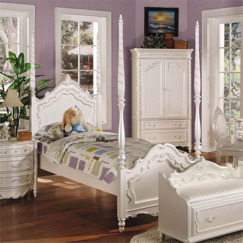 | ACME Pearl Twin Poster Bed in Pearl White and Gold |