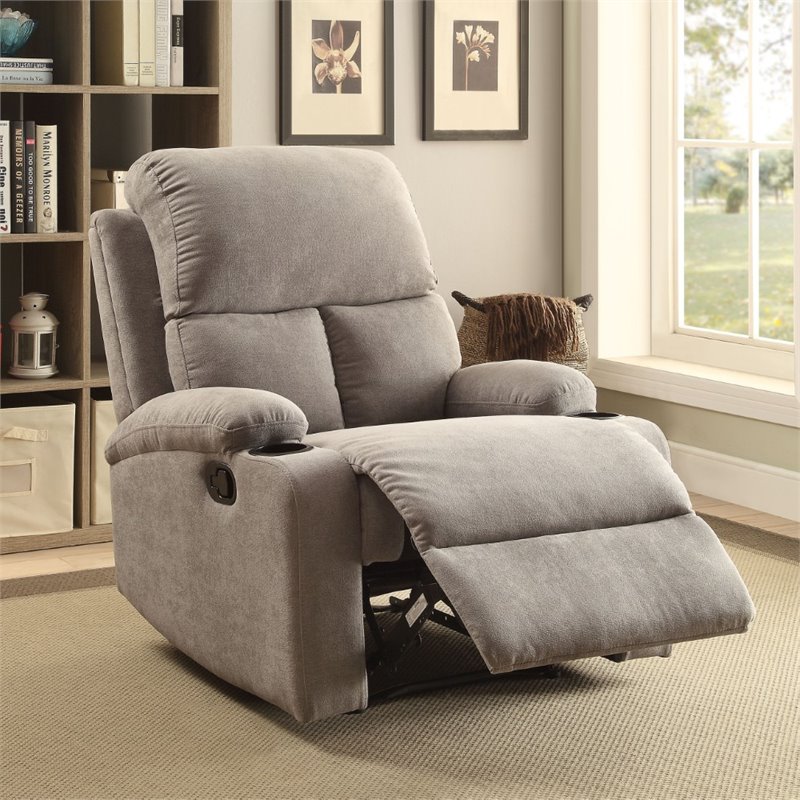 | ACME Furniture - Recliners - 59549 - For ultimate comfort, the Rosia linen recliner is covered with smooth fabric in various color options to match with any home decor. Additional back comfort is created by the vertical stitch line and tuft while the horizontal section makes room for your shoulders. Sweeping arched overstuffed armrests are added to the comfort level by elevating your arms at an angle while reclined. Finish: Gray Tight Back and Seat Cushion Seat: Pocket Coil TBCPillow Top ArmArm With Cup HolderExternal Latch Handle (No Power)Motion: Reclining FunctionSpecifications:Overall Product Dimensions: 39 H x 32 W x 37 DProduct Weight: 78 lbs
