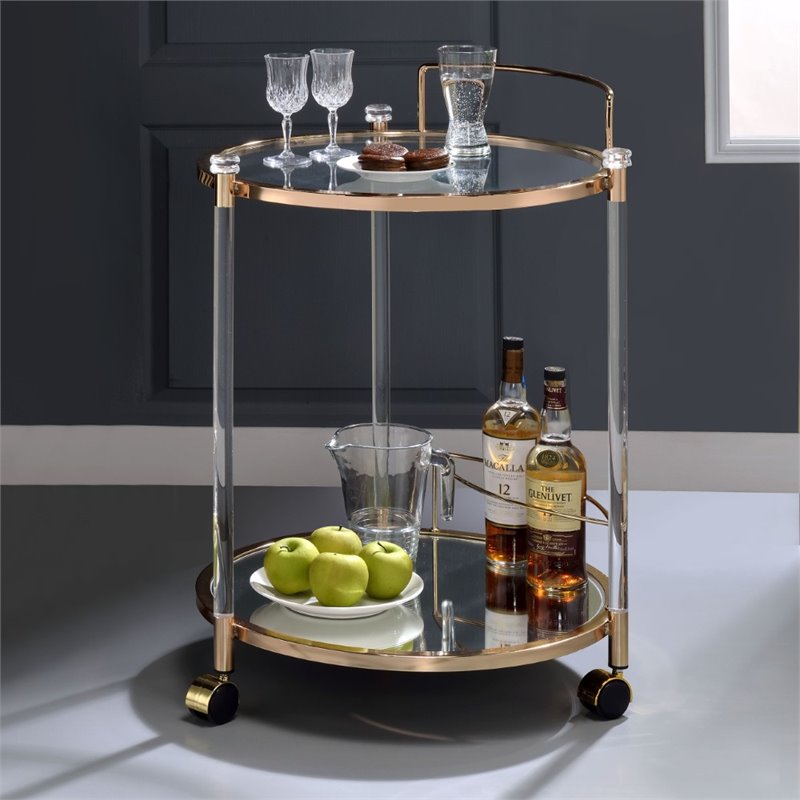 | ACME Furniture - Kitchen Carts - 98199 - Combining a mix of acrylic legs supporting a gold metal framed glass top and mirror bottom, the Todd serving cart is a beautiful functional piece of furniture. It features two glass and mirror shelves for placing your dishes and dining accessories, and also comes with wine bottle rack holder for serving the drink. It will allow you to serve your company with a sense of style and happiness. Finish: Clear Glass and Gold Open Storage With 2 ShelvesWine Bottle Rack Holder Top Shelf: 5mm Clear Tempered GlassBottom Shelf: 5mm Mirror Metal Frame & HandlesServing CartSpecifications:Overall Product Dimensions: 33 H x 23 W x 22 DProduct Weight: 23 lbs
