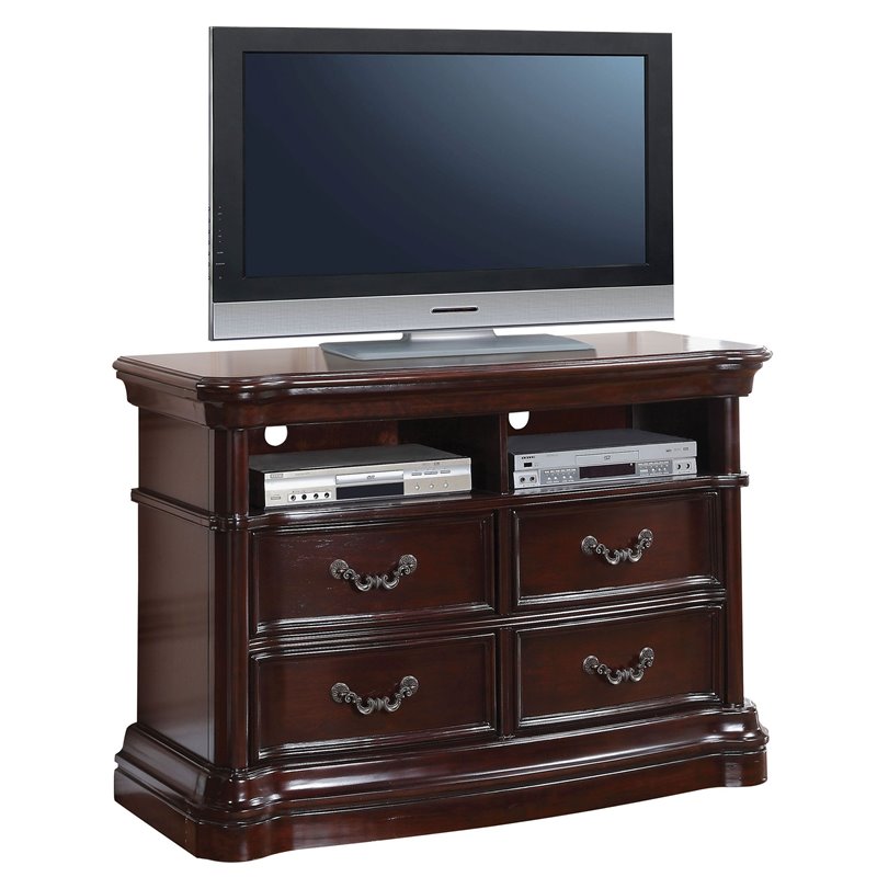| ACME Furniture - TV Stands - 20638 - Saving Grace. Give your bedroom all the grandeur of American colonial style with our Veradisia collection. Presented in a stately dark cherry finish, each piece has a substantial silhouette and is adorned with such old world details, carved medallions, shaped moldings and intricate scrollwork. The bed features a soaring headboard with a button tufted selected PU panel and a storage footboard, whose curves are echoes in the shaped fronts of the dresser, nightstand and chest for a carefully coordinated look. Finish: Dark CherryMaterial: rubber wood, Bentwooddrawersdrawers GL: Side Metal (Ball Bearing), DT: French Front & English Back, Felt Lined Top DrawerSpecifications:Overall Product Dimensions: 33.74 H x 50 W x 20 DProduct Weight: 131 lbs