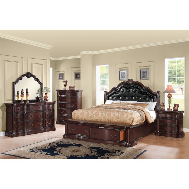 | ACME Furniture - Beds - 20630Q - Saving Grace. Give your bedroom all the grandeur of American colonial style with our Veradisia collection. Presented in a stately dark cherry finish, each piece has a substantial silhouette and is adorned with such old world details, carved medallions, shaped moldings and intricate scrollwork. The bed features a soaring headboard with a button tufted selected PU panel and a storage footboard, whose curves are echoes in the shaped fronts of the dresser, nightstand and chest for a carefully coordinated look. Finish: Black and Dark CherryMaterial: rubber wood, Bentwood14 Slats - Box Spring not requiredSpecifications:Overall Product Dimensions: 71 H x 86 W x 72 DProduct Weight: 269 lbs