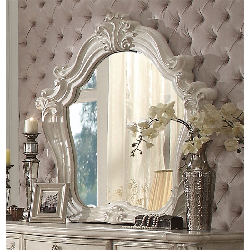 | ACME Furniture - Mirrors - 21134 - The Versailles Collection harmonizes traditional details with functional design to accommodate today’s styles. This bedroom collection features bone white veneers, nailhead trim accents, button tufted headboard/ footboard, padded side rails, and hand-carved style wood drawer overlays throughout all case pieces. The ample storage case pieces, beveled mirror, felt lined drawers, and antique finish hardware make this set truly elegant and will be a great addition to your home. Finish: Bone and WhiteMaterial: Poplar wood, Aspen Wood, wood veneer, poly resin décorScrolled Frame: Poly Resin Ornamental Detail in Bone White With Silver Contrast FinishSpecifications:Overall Product Dimensions: 46.85 H x 48.43 W x 4.13 DProduct Weight: 61 lbsBeveled Mirror: 1 Thick