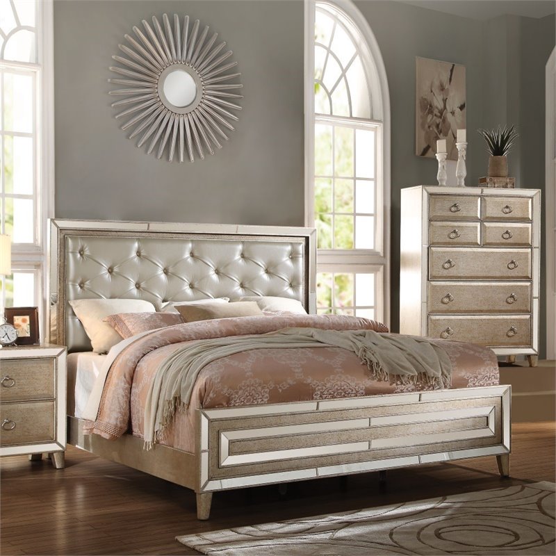 | ACME Furniture - Beds - 21000Q - The Voeville collection will create a warmer and transitional environment in your master bedroom with the antique white finish. Button Tufted/PU panel headboard create a unique and more relaxing look in your bedroom with the Voeville Collection. Finish: Gold and Antique White; 3 Slats - Box Spring Required. Specifications:Overall Product Dimensions: 60 H x 87.09 W x 63.5 D; Product Weight: 95 lbs.