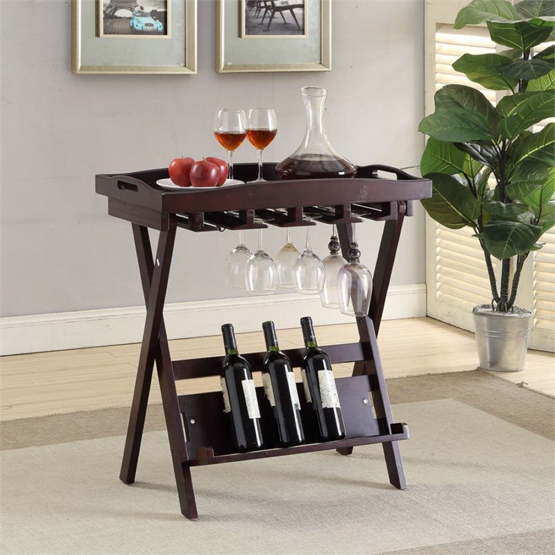 | ACME Furniture - Wine Racks - 97376 - Enjoy the functions of a small serving tray that not only serve as a tray table but also with the capability to hold and display wine bottles and stemware. When not being used, this table can be folded up easily and stored out of the way. Finished in classic espresso, this functional piece will blend in with any decor. Finish: Espresso With wine bottle and wine glass rack Top: Tray table and wine glass rackWooden X style legConvertible TrayWood frameRectangular folding tray tableSpecifications:Overall Product Dimensions: 31 H x 28 W x 15 DProduct Weight: 25 lbs